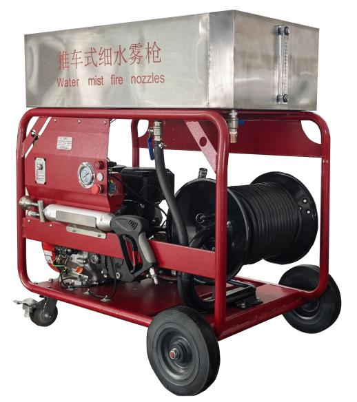 推车式高压细水雾灭火装置,以直流/交流电动机、汽油发动 机、柴油发动机为动力源,以自带水箱的水为灭火介质,可扑灭 A类、B类、C类及电气设备火灾。该系列产品可随时移动,灵活 机动,具有结构紧凑、操作简单、灭火能力强、可持灭火、对环境 无污染及对人体无伤害等特点。适用于大型车间厂房、商业场 所、社区、地铁车站、隧道及再建工程。